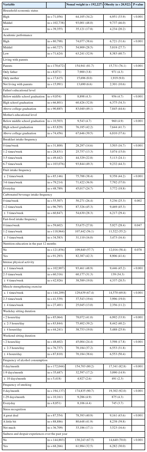 | Variable | Nomal weight (n = 192,227) | Obesity (n = 20,922) | P-value | |