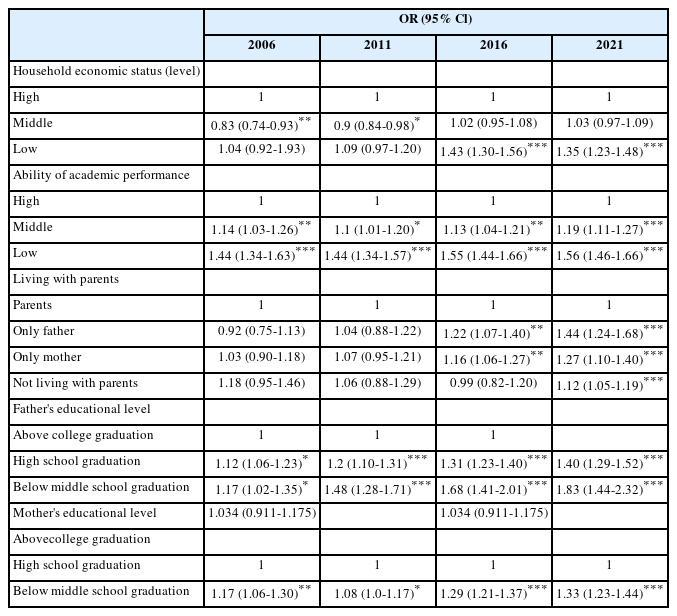 | Below middle school graduation | 1.17 (1.02-1.35)* | 1.48 (1.28-1.71)*** | 1.68 (1.41-2.01)*** | 1.83 (1.44-2.32)*** |