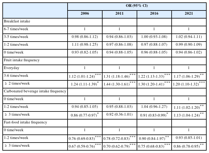 | ≥ 3 times/week | 0.86 (0.77-0.97)* | 0.92 (0.36-1.01) | 0.91 (0.83-0.99)* | 1.13 (1.04-1.24)** |