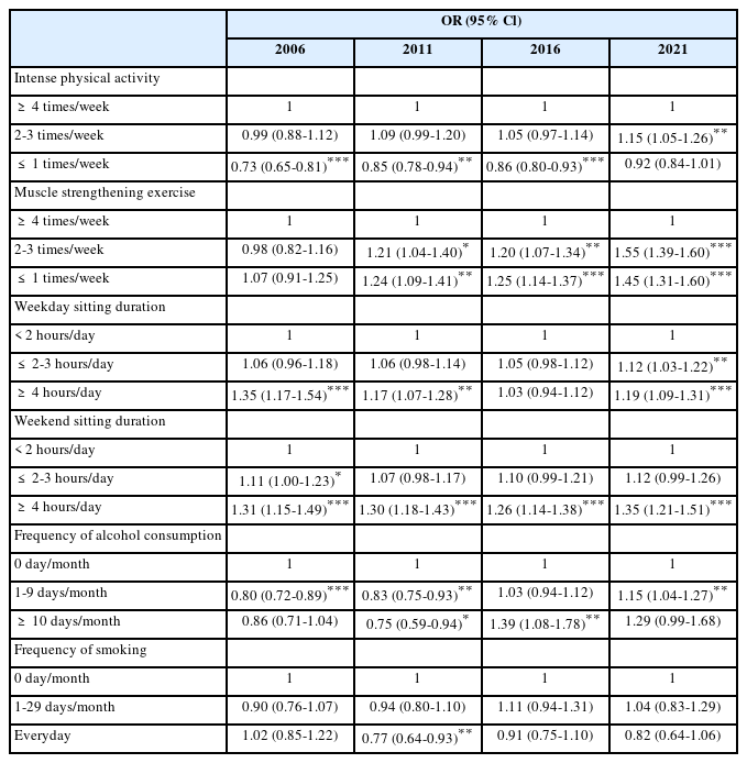 | 2-3 times/week | 0.98 (0.82-1.16) | 1.21 (1.04-1.40)* | 1.20 (1.07-1.34)** | 1.55 (1.39-1.60)*** |