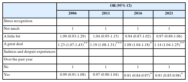 | Below middle school graduation | 1.17 (1.06-1.30)** | 1.08 (1.0-1.17)* | 1.29 (1.21-1.37)*** | 1.33 (1.23-1.44)*** |