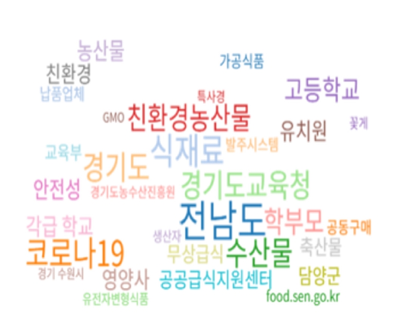 학교급식 뉴스기사 컨텐츠를 분석한 결과, 소비자 인식과 직접적으로 관련된 기사 내용은 거의 없었으며, 학교급식에 대하여 긍정적 혹은 부정적 인식에 대한 기사도 찾기 어려웠다. 관련 기사를 주제별로 묶어본 결과, 위생안전, 지역농산물, 친환경 식재료, 교육 및 연수, 조리종사자의 업무 과중, 채식식단 제공, 학교급식법, IT, 영양교육, 식단개발, 급식 홍보, 급식 예산 관리 등으로 구분할 수 있었다. 워드클라우드 분석 결과는 Fig. 1과 같다. 워드클라우드는 기사에서 제공하는 키워드의 빈도수를 반영하여 시각적으로 표현한 것으로 빈도수가 높을수록 키워드 크기가 크게 표시된다. 주요 핵심 키워드는 친환경농산물, 전남도, 식재료, 코로나19, 경기교육청, 안전성, 수산물, 등이 이슈로 나타났다.