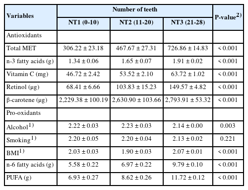 | Vitamin C (mg) | 46.72 ± 2.42 | 53.52 ± 2.10 | 63.72 ± 1.02 | < 0.001 |