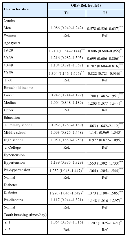 OR (95% CI). ORs indicate the likelihood of belonging to the T1 or T2 OBS categories. OBS, oxidative balance score; Ref, reference; OR, odds ratio; CI, confidence interval.