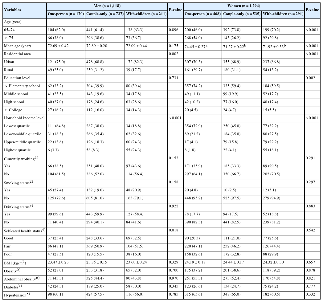 n (weighted %) or weighted mean ± SE. Statistical analysis: Values were obtained using the general linear model for continuous variables and the BMI, body mass index. Currently working: “Yes” = currently employed; “No” = unemployed or economically inactive individuals. Smoking status: “Yes” = current smoker; “No” = former smoker or never smoker. Drinking status: “Yes” = consumed alcohol at least once a month in the past year; “No” = lifetime abstainer or consumed less than once a month. Self-rated health status: “Good” = very good or good, “Fair” = fair, “Poor” = poor or very poor. Obesity: defined as BMI ≥ 25 kg/m2. Abdominal obesity: defined as a waist circumference ≥ 90 cm for men and ≥ 85 cm for women. Diabetes: defined as fasting plasma glucose (FPG) ≥ 126 mg/dL, HbA1c ≥ 6.5%, or current use of antidiabetic medication. Hypertension: defined as systolic blood pressure ≥ 140 mmHg, diastolic blood pressure ≥ 90 mmHg, or current use of antihypertensive medication. Values are significantly different according to the Bonferroni post hoc test (