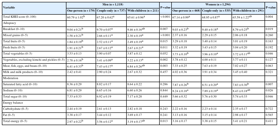 Mean ± SE. Statistical analysis: Values were obtained using the general linear model for continuous variables in complex sample survey data analysis ( All variables were adjusted for age, residential area, education level, household income, economic activity status, self-rated health, and survey year. KHEI, Korean Healthy Eating Index. Values are significantly different according to the Bonferroni post hoc test (