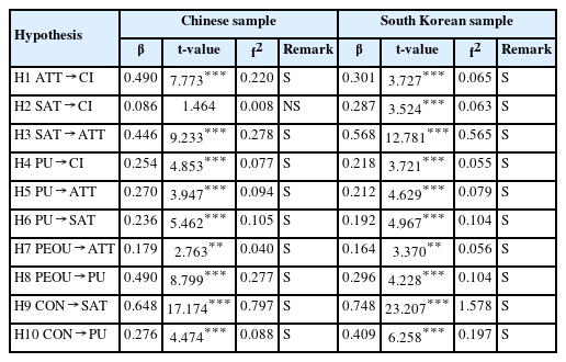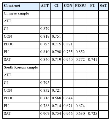 CN, Chinese sample; KR, South Korean sample; ATT, attitude; CI, continuance intention; CON, confirmation; PEOU, perceived ease of use; PU, perceived usefulness; SAT, satisfaction.