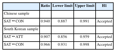 H0, HTMT ≥ 1; H1, HTMT < 1. If H0 holds indicates a lack of discriminant validity. ATT, attitude; CON, confirmation; SAT, satisfaction.
