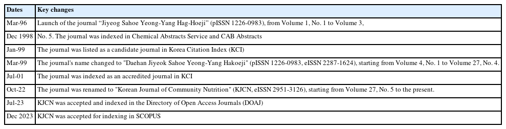 | Oct-22 | The journal was renamed to "Korean Journal of Community Nutrition" (KJCN, eISSN 2951-3126), starting from Volume 27, No. 5 to the present. |