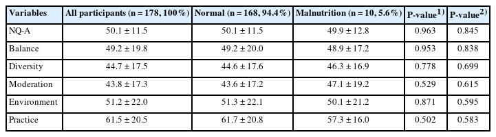 | Variables | All participants (n = 178, 100%) | Normal (n = 168, 94.4%) | Malnutrition (n = 10, 5.6%) | P-value1) | P-value2) |