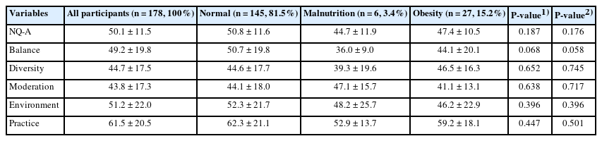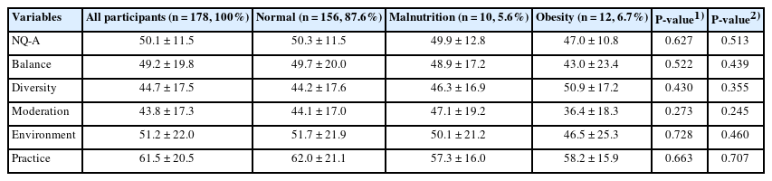 | Variables | All participants (n = 178, 100%) | Normal (n = 156, 87.6%) | Malnutrition (n = 10, 5.6%) | Obesity (n = 12, 6.7%) | P-value1) | P-value2) |