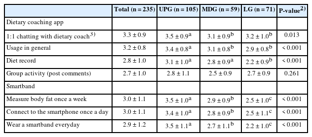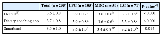 | Dietary coaching app | 3.7 ± 0.8 | 3.9 ± 0.8a | 3.6 ± 0.6b | 3.3 ± 0.8c | < 0.001 |