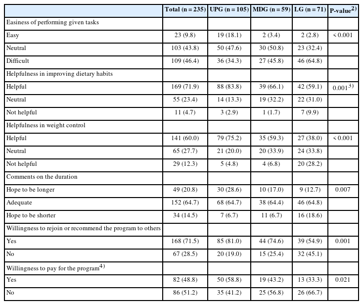 | 1:1 chatting with dietary coach3) | 3.3 ± 0.9 | 3.5 ± 0.9a | 3.1 ± 0.9b | 3.2 ± 1.0b | 0.013 |