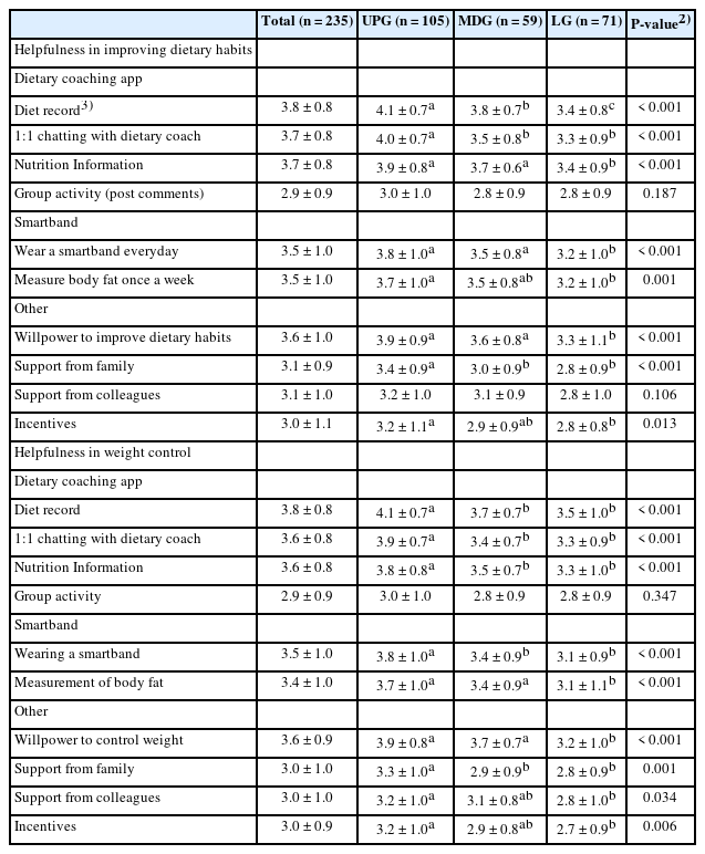 Mean ± SD Engagement level was calculated by scoring the usage data of the dietary coaching app and smartband, and was categorized into three groups: UPG, MDG, and LG. The responses were based on a 5-point Likert scale: 1 = not helpful at all, 2 = not helpful, 3 = neutral, 4 = helpful, and 5 = very helpful. UPG: upper group, MDG: median group, LG: lower group