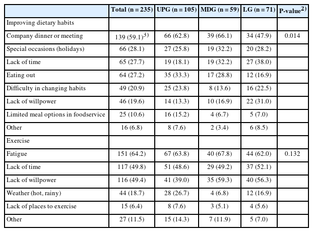| Lack of willpower | 116 (49.4) | 41 (39.0) | 35 (59.3) | 40 (56.3) | |