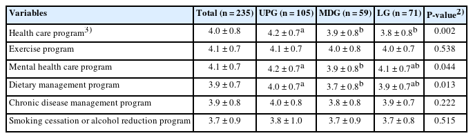 | Health care program3) | 4.0 ± 0.8 | 4.2 ± 0.7a | 3.9 ± 0.8b | 3.8 ± 0.8b | 0.002 |