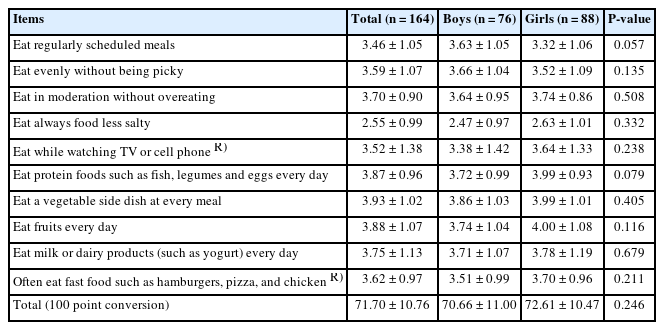 Mean ± SD Means with different lowercase letters in the same row are significantly different by Duncan’s multiple range test at reverse response; 5-point Likert scale: The higher the score, the more desirable eating habits were formed.