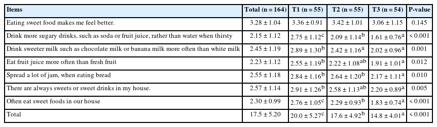 | Often eat sweet foods in our house | 2.30 ± 0.99 | 2.76 ± 1.05c | 2.29 ± 0.93b | 1.83 ± 0.74a | < 0.001 |