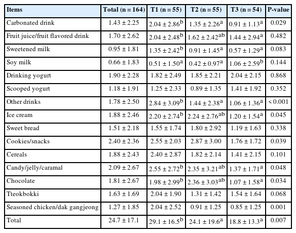 | High-sugar food consumption frequency5) | 17.5 ± 9.1a | 15.7 ± 9.8a | 29.8 ± 19.4b | < 0.001 |