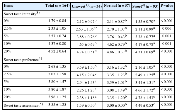 | Items | Total (n = 164) | Unsweet1) (n = 34) | Normal (n = 37) | Sweet2) (n = 93) | P-value |