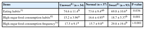 Mean ± SD Means with different lower case letters in the same row are significantly different by Duncan’s multiple range test at Unsweet: very unsweet and unsweet Sweet: sweet and very sweet The higher the score, the more desirable eating habits were formed. The higher the high-sugar food consumption habit score, the higher the sugar consumption. The higher the high-sugar food consumption frequency score, the higher the sugar consumption.