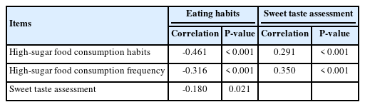 | High-sugar food consumption habits | -0.461 | < 0.001 | 0.291 | < 0.001 |