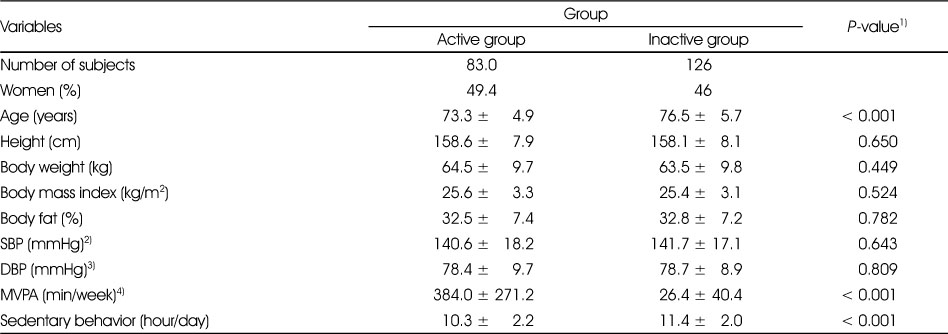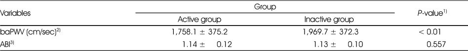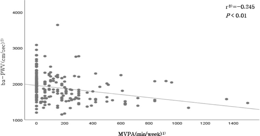 The mean age of total subjects was 75.3 ± 5.6 years. There was no significant difference in sex distribution between the active group (39.7%) and inactive group (60.3%). The baPWV (1,758.1 ± 375.2cm /sec) of the active group was significantly lower than that (1,969.7 ± 372.3 cm/sec) of the inactive group (P < 0.05). There was a significant inverse association between time spent in MVPA and baPWV (r = -0.245, P < 0.01).