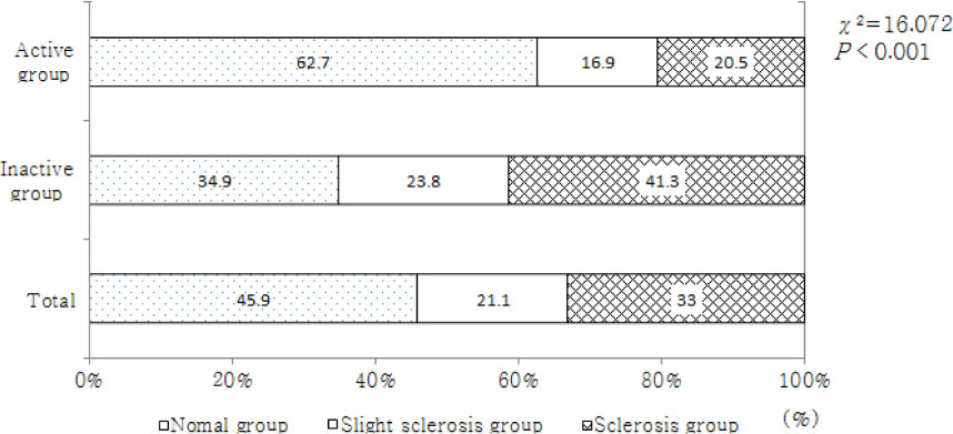 Normal group: < mean + 1SD of baPWV; slight sclerosis group: ≥ mean + 1SD and < mean + 2SD; sclerosis group: ≥ mean + 2SD according to age and sex.