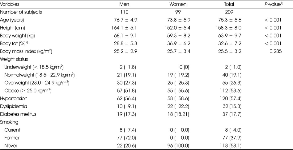 A total of 209 older adults (110 men and 99 women) participated in this study. Arterial stiffness of subjects such as brachial–ankle pulse wave velocity (baPWV) and ankle brachial pressure index (ABI) was measured using a non-invasive vascular screening device (VP-1000 Plus, Omron, Kyoto, Japan). The interviewed Korean version of the international physical activity questionnaire short form (IPAQ-SF) was used to evaluate subject’s physical activity level and classify subjects as active or inactive group based on the time spent doing moderate to vigorous physical activity (MVPA).