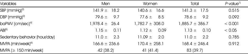 A total of 209 older adults (110 men and 99 women) participated in this study. Arterial stiffness of subjects such as brachial–ankle pulse wave velocity (baPWV) and ankle brachial pressure index (ABI) was measured using a non-invasive vascular screening device (VP-1000 Plus, Omron, Kyoto, Japan). The interviewed Korean version of the international physical activity questionnaire short form (IPAQ-SF) was used to evaluate subject's physical activity level and classify subjects as active or inactive group based on the time spent doing moderate to vigorous physical activity (MVPA).
