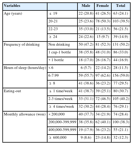| Monthly allowance (won) | < 200,000 | 40 (37.7) | 34 (21.9) | 74 (28.4) |