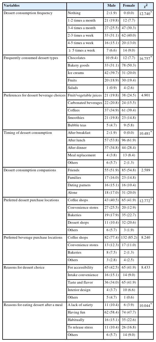| Preferred dessert purchase locations | Coffee shops | 43 (40.5) | 65 (41.9) | 12.772* |