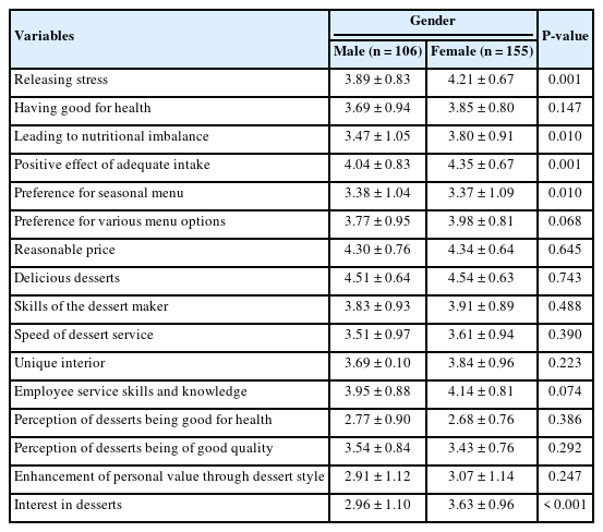 | Enhancement of personal value through dessert style | 2.91 ± 1.12 | 3.07 ± 1.14 | 0.247 |