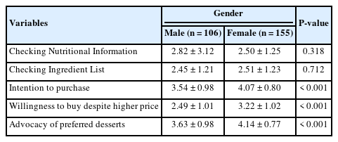 | Perception of desserts being good for health | 2.77 ± 0.90 | 2.68 ± 0.76 | 0.386 |