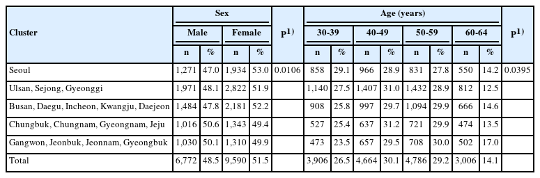 | Busan, Daegu, Incheon, Kwangju, Daejeon | 1,484 | 47.8 | 2,181 | 52.2 | 908 | 25.8 | 997 | 29.7 | 1,094 | 29.9 | 666 | 14.6 | ||