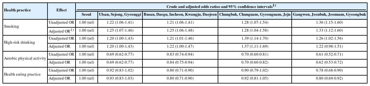 | Health practice | Effect | Crude and adjusted odds ratios and 95% confidence intervals |