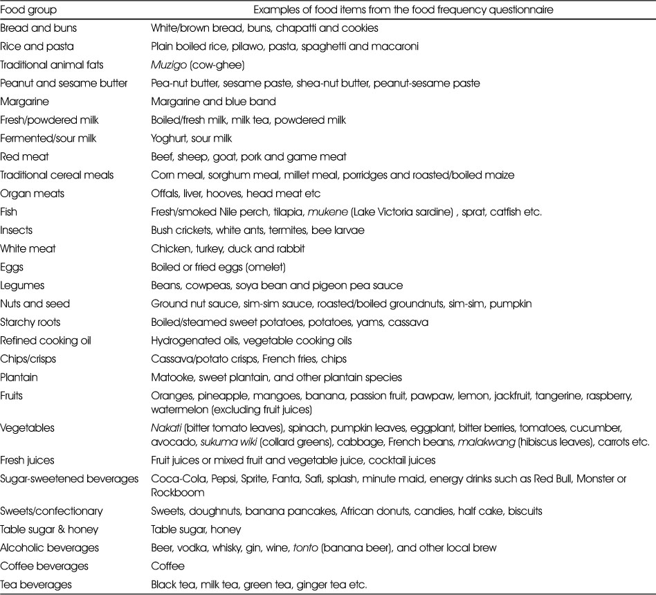 Dietary intake was assessed using a qualitative food frequency questionnaire that consisted of locally consumed foods in Uganda classified into 34 food groups according to recent studies [8, 29]. The frequency of food consumption over the past year was categorized into six (6) responses (from ‘never/rarely’ to ‘few times a day’). For each food group, the frequencies were weighted and converted to frequency of consumption per day (times/day). For example, “once/day was assigned a weight of 1.0 and 5 ~ 6 times/week was assigned the average of 5 and 6 divided by 7. The daily frequency ranged from 0 ~ 2 times/day [30].