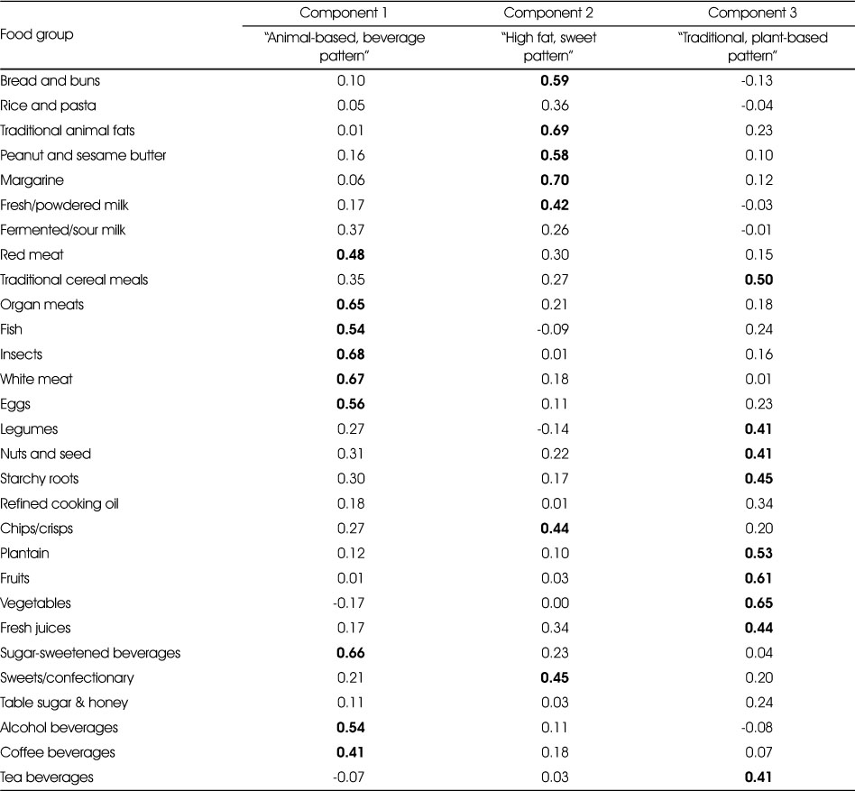 The 29 food groups and corresponding food items used to derive dietary patterns are shown in Table 2. Table 3 shows the factor loadings of different food items on the 3 principal components. Three components that explained 33.2% of the total variance in food groups were generated. The components were labelled based on the food items with a factor loading of ≥ 0.4. The first component highly correlated with meats, fish, insects, eggs, SSB, alcoholic and coffee beverages and hence was labelled “animal-based, beverage pattern”. The second component had high factor loadings on bread and buns, fats, milk, chips, sweets and confectionary and was thus labelled “high-fat, sweet pattern”. The third component was highly correlated with traditional cereals, legumes, nuts and seeds, starchy roots, plantain, and fresh juices and was thus labelled “traditional, plant-based pattern”.