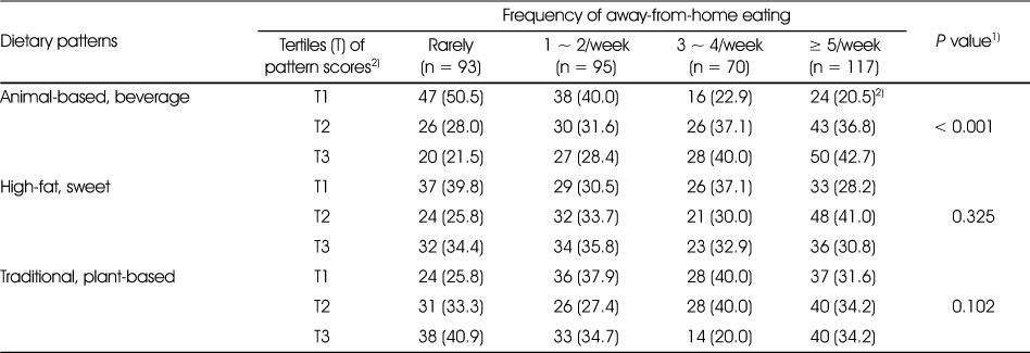 Bivariable association between tertiles of dietary pattern scores and frequency of away-from-home eating (n = 375)