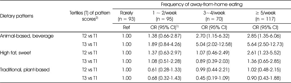 Results of the bivariable association between AFH eating and tertiles of the three dietary patterns are presented in Table 4. The distribution of participants across tertiles of the animal-based, beverage pattern significantly differed across frequency of AFH. The proportion of participants in the extreme tertile of the animal-based, beverage pattern was highest among frequent AFH eaters compared to rare eaters. However, except the traditional, plant-based pattern, both the animal-based beverage and high fat, sweet patterns were significantly associated with AFH after adjusting for potential covariates (Table 5). Participants who ate AFH ≥ 5 times/week were 2.85 times more likely to be in the second tertile and 5.64 times more likely to be in the third tertile of the animal-based, beverage pattern compared to rare eaters (OR = 2.85, 95% CI:1.35-6.06 for T2 vs T1; and OR = 5.64, 95% CI:2.50-12.73 for T3 vs T1). In addition, those who ate AFH 3 ~ 4 times/week were 2.70 times and 5.04 times more likely to be in the second and third tertile of the animal-based, beverage pattern respectively, compared to rare AFH eaters (OR = 2.70, 95% CI: 1.15-6.32 for T2 vs T1; and OR = 5.04, 95% CI: 2.02-12.58 for T3 vs T1). On the other hand, the odds of being in the second tertile of the high fat, sweet pattern were significantly higher for frequent AFH eaters compared to rare eaters (OR = 2.61, 95% CI:1.23-5.52).